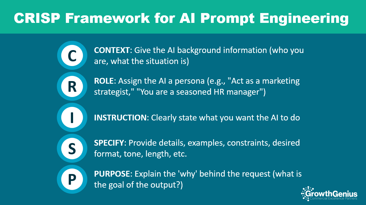 At the heart of our consulting philosophy is Lean thinking: creating more value with less work by systematically eliminating waste and continuously improving processes. We believe these same principles are crucial for successful AI integration. One of the most effective models for this is the CRISP framework, a powerful and distinctly Lean approach to interacting with AI that ensures clarity, reduces rework and waste, and drives meaningful results. CRISP is an easy-to-remember acronym for context, role, instruction, specificity, and purpose. Including all of these in your AI prompts will help you to get optimal AI outputs.